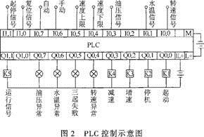 圖2為智能型柴油機泵組自動控制部分硬件線路電路圖。智能控制器采用德國西門子的S7—200系列產品,各種輸入信號通過開關按鈕及相關傳感器從現(xiàn)場采集。輸出信號通過各種執(zhí)行器控制柴油機的運行狀態(tài)。