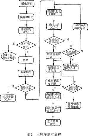 圖3為柴油機自動控制的基本功能程序流程圖,其中詳細地表達出了柴油機消防泵組接受起動信號起動柴油機至穩(wěn)定工況,及接受停止信號停止柴油機的全自動調節(jié)過程。采用西門子S7—200系列PLC,其強大的功能指令集和基于Windows的編稗工具.使得稗序編寫方便簡單。
