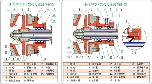 該密封主要由副葉輪(或副葉片)與停車密封(橡膠油封)組成。工作時由于副葉輪(或副葉片)旋轉(zhuǎn)產(chǎn)生的離心力使密封腔處于負壓狀態(tài),從而阻止液體向外泄漏,此時,停車密封不起作用。橡膠油封的唇口因負壓而松開,與軸套產(chǎn)生一定間隙,減小其之間的磨損,延長了使用壽命;停機時,由于副葉輪(或副葉片)停止旋轉(zhuǎn),密封腔由負壓轉(zhuǎn)為正壓,停車密封開始工作,橡膠油封的唇口在壓力作用下緊緊包住軸套,從而達到密封目的。若允許冷卻水滲入介質(zhì)內(nèi),可選用帶冷卻水K型動力密封,即可添加外冷卻水裝置,延長油封的使用壽命。該密封的油封采用氟橡膠制成,主要適用于輸送含固體顆粒的料漿、含雜質(zhì)的污水等腐蝕性介質(zhì)(帶冷卻水K型動力密封用的冷卻水為潔凈的自來水,壓力適宜在0.05Mpa以內(nèi))。