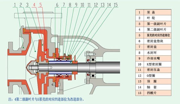 UHB-ZK-AB型耐腐耐磨泵是對UHB-ZK-A系列泵的改進型泵(見上圖)。兩者之間的區(qū)別在于后者是無臺階式背葉片,前者為臺階式背葉片結(jié)構(gòu)(見圖中序號4)。改進后的葉輪的背葉分為二級,二級背葉片之間有凸起臺階。與之相匹配的泵也有凹進的臺階。設置背葉輪臺階的目的是阻斷泵出口流體壓力對軸密封的返流壓力,保證和延長軸密封的使用壽命。