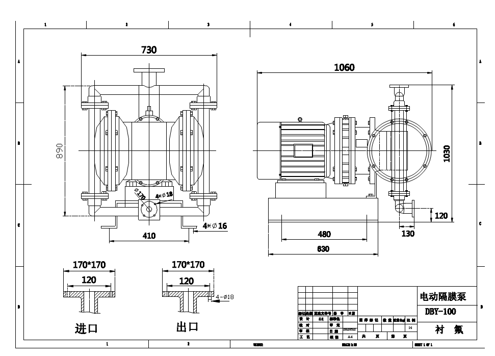 DBY-100臥式襯氟電動隔膜泵安裝尺寸圖: