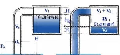 泵啟動(dòng)后,液面下降,達(dá)到穩(wěn)定運(yùn)行工作后,罐內(nèi)應(yīng)存有一定體積量V3的水,而氣體之外的罐內(nèi)空氣體積為V1+V2。罐內(nèi)部的壓力為P1,壓力小于外界大氣壓力Pa。
