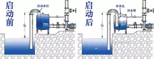 當(dāng)水泵啟動(dòng)之后,水泵會(huì)先抽取真空罐內(nèi)的水,真空罐內(nèi)的液位下降,管內(nèi)形成真空,壓力低于水池液面的大氣壓力,此時(shí)水就會(huì)沿著吸入管進(jìn)入真空罐。當(dāng)水泵的排液和吸入管路的進(jìn)液達(dá)到平衡,真空罐內(nèi)的液位也就不會(huì)再下降,達(dá)到穩(wěn)定工作狀態(tài)。泵也就達(dá)到了額定工作狀態(tài),源源不斷地將水輸送出去(公眾號:泵管家)。