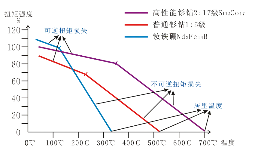 當(dāng)溫度超過150℃,釹鐵硼材質(zhì)的磁鋼將會進(jìn)入不可逆扭轉(zhuǎn)損失。當(dāng)溫度超過250℃,普通釤鈷材質(zhì)的磁鋼將會進(jìn)入不可逆扭轉(zhuǎn)損失。