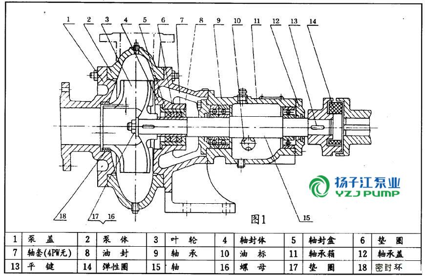 本型泵主要由:泵蓋(1),泵體(2),葉輪(3),軸(15),軸封體(4),軸承箱(11))及聯(lián)軸器部件等組成〈見圖1:結(jié)構(gòu)圖〉