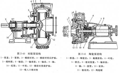 襯膠泵結(jié)構(gòu)如圖2-40所示。其大流量可達(dá)1500m3/h,大揚(yáng)程可達(dá)50 m,高使用溫度80℃,高使用壓力1.6 MPa。襯膠泵能用于輸送硫酸、鹽酸、磷酸、氫氟酸、氫氧化鉀等強(qiáng)腐蝕性介質(zhì),并適合輸送含有顆粒的腐蝕性液體,但不能用于輸送濃硫酸、濃硝酸等強(qiáng)氧化性酸。