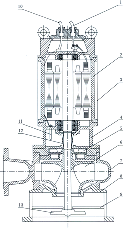 結(jié)構(gòu)特點(diǎn)說明 1、采用獨(dú)特的雙流道無堵塞葉輪結(jié)構(gòu),提高污水污物的過流能力和排污能力。 2、自動攪拌裝置,產(chǎn)生極強(qiáng)的攪拌力,將池內(nèi)的沉淀物攪拌成懸浮物后吸入葉輪排出,達(dá)到清淤的作用。 3、隔板將底座一分為二,攪拌與進(jìn)水互不影響。 4、機(jī)械密封為雙端面機(jī)械密封,長期處于油室中,保證水泵安全可靠地運(yùn)行。 5、副葉輪結(jié)構(gòu)的流體動力密封,既有輔助密封作用,從而保護(hù)機(jī)械密封,又平衡軸向力,延長軸承的使用壽命。 6、泵連線腔內(nèi)沒有漏水檢測探頭,出現(xiàn)漏水時,探頭發(fā)出信號,控制系統(tǒng)對泵實(shí)施保護(hù),本公司可配全自動安全保護(hù)控制柜。 7、電機(jī)定子采用B級和F級絕緣,內(nèi)設(shè)熱保護(hù)器,當(dāng)電機(jī)過載發(fā)熱,保護(hù)器及時作出動作,對泵和電機(jī)實(shí)施絕對的保護(hù)。 8、油室內(nèi)裝有油水探頭,當(dāng)機(jī)械密封損壞后,水進(jìn)入油室,探頭發(fā)出信號由控制系統(tǒng)對水泵實(shí)施保護(hù)。 9、JPWQ帶內(nèi)循環(huán)冷卻系統(tǒng),能保證水泵在水池低水位正常工作。