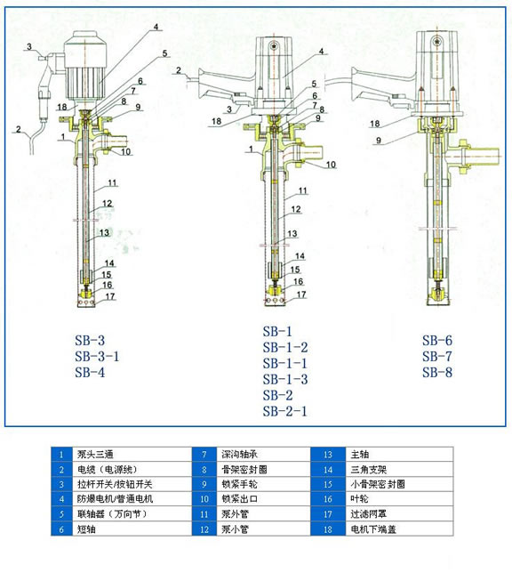 揚(yáng)子江SB系列插桶泵(油桶泵,電動抽液泵)可以直接插入物料桶(大適用于符合GB/325-1991標(biāo)準(zhǔn)的鋼桶)中抽取桶中液體?奢斔透鞣N油料、帶腐蝕性化學(xué)藥水、其他液體。根據(jù)所輸送的液體性質(zhì),泵體沾濕部分材料可選用鋁合金、不銹鋼,316不銹鋼等組成。驅(qū)動電機(jī)配備單相標(biāo)準(zhǔn)電機(jī),防爆電機(jī),高轉(zhuǎn)速電機(jī)等多種選擇。根據(jù)材質(zhì),電機(jī)不同,型號可分為: SB-1,SB-2,SB-3,SB-3-1,SB-4,SB-5,SB-6,SB-7,SB-8系列鋁合金,不銹鋼或防爆型。我們備有詳細(xì)資料,歡迎索取。揚(yáng)子江該系列泵可按防爆區(qū)域和非防爆區(qū)域選用,凡在防爆區(qū)域使用配置防爆型電機(jī),這類電機(jī)分三種機(jī)組型號,當(dāng)使用條件含各種易燃易爆混合時,應(yīng)選用高組級。