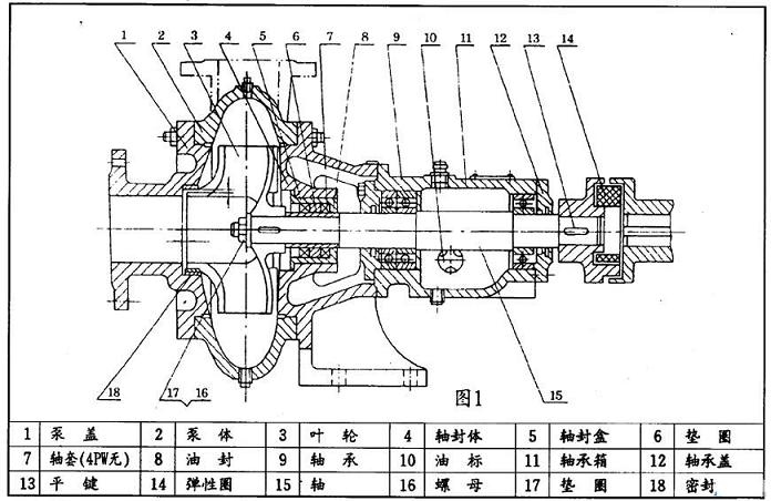 本型泵主要由:泵蓋(1),泵體(2),葉輪(3),軸(15),軸封體(4),軸承箱(11))及聯(lián)軸器部件等組成〈見圖1:結(jié)構(gòu)圖〉