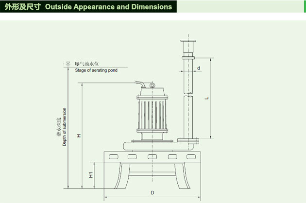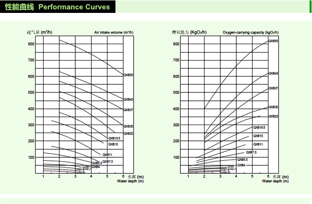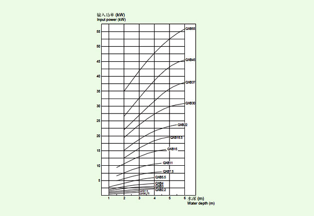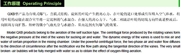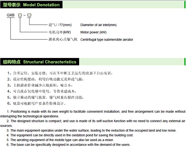 QXB型潛水離心式曝氣機采用電機和葉輪直接傳動,利用葉輪旋轉所產(chǎn)生的離心力排開周圍水形成低壓區(qū)吸入水流同時,在葉輪進口處制造真空而吸入空氣,在混氣室中氣與水充分混合形成均勻的氣水混合液,在離心力作用下快速排出。由于水流噴射極強,造成有效的水流循環(huán),使空氣被剪切成大量的微小氣泡。極大提高了其表面積,且由于氣泡上升緩慢使空氣中大量的氧溶于水中,使得該機動力效率優(yōu)于其它種類的曝氣機。
