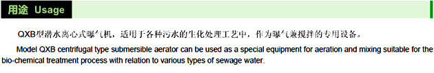 QXB型潛水離心式曝氣機用于各種污水處理工程中生化處理工藝的曝氣池、曝氣沉砂池、預曝氣池、好氧硝化池曝氣充氧混合及養(yǎng)殖塘增氧。
