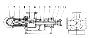 I-1B系列濃漿泵是單螺桿式容積回轉泵,該泵利用偏心單螺旋的螺桿在雙螺旋襯套內(nèi)的轉動,使?jié)鉂{液沿螺旋槽由吸入口推移至排出口,實現(xiàn)泵的輸送功能。