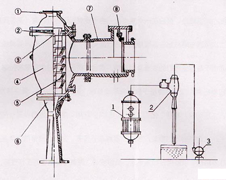 水力噴射器由器體、器蓋、噴咀、噴咀座板、導(dǎo)向盤、擴(kuò)壓管及單向閥等部件組成,噴咀用不銹鋼制造,噴咀座板由優(yōu)質(zhì)鋼加工,其余零件則系鑄鐵鑄造。噴咀采用多噴咀的結(jié)構(gòu)形式,以便得到較大的水—汽接觸,有利于熱交換的進(jìn)行,獲得較好的真空效果。噴咀座板加工精密,精度較高,以使噴射水流準(zhǔn)確地聚集在同一的焦點(diǎn)。導(dǎo)向盤用于減慢蒸汽(或空氣)的流速,使蒸汽均勻地導(dǎo)入器室以免噴射水流偏斜,降低抽射效能。整個(gè)裝置結(jié)構(gòu)緊湊精密,強(qiáng)度高,用于真空蒸發(fā)系統(tǒng)中,由于能把冷凝器的冷凝作用與真空泵的抽氣作用合并在一個(gè)設(shè)備中同時(shí)完成,大大地簡(jiǎn)化了工藝流程,比之原來(lái)真空泵加舊式冷凝器的裝置,可以節(jié)省去真空泵、冷凝器、分水器等設(shè)備,并且還有下列優(yōu)點(diǎn):