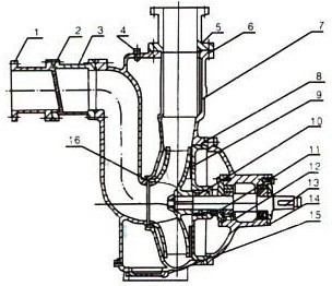 ZW型自吸式無堵塞排污泵,主要由泵體, 葉輪、后蓋、機械密封、泵軸、軸承座、進口閥、氣液分離管、加水閥門、進、排接管等組成。泵的結(jié)構(gòu)見圖。ZW型自吸排污泵的工作原理:泵體內(nèi)設(shè)有儲液腔,并通過上方的回流孔和下方的循環(huán)孔與泵工作腔相通,構(gòu)成泵的軸向加流外混式系統(tǒng)。泵停止工作后,泵內(nèi)腔已儲有一定容積的液體。當泵起動時,有關(guān)當局內(nèi)的儲液在葉輪的作用下,夾帶著空氣被向上拋出,液體通過氣液分離管的網(wǎng)格回流到工作腔,氣體被排出泵外,使泵內(nèi)形成一定的真空度,達到自吸的作用。