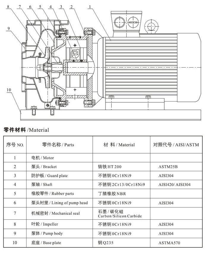ZS型不銹鋼臥式單級離心泵為泵軸直聯(lián)型聯(lián)結,由泵、泵軸和標準電機組成: