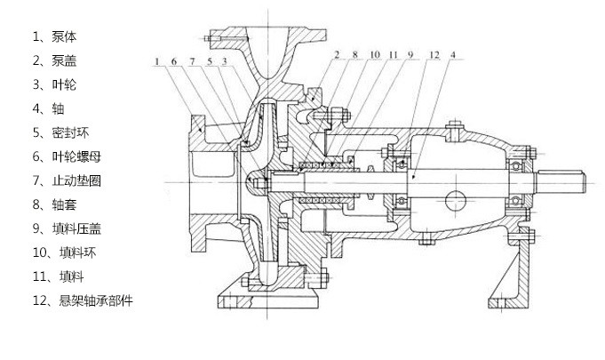 6、單級清水離心泵為避免軸磨損,在軸通過填料腔的部位裝有軸套保護(hù)。軸套與軸之間準(zhǔn)有O型密封圈,以防止沿著配合表面進(jìn)氣或漏水。
