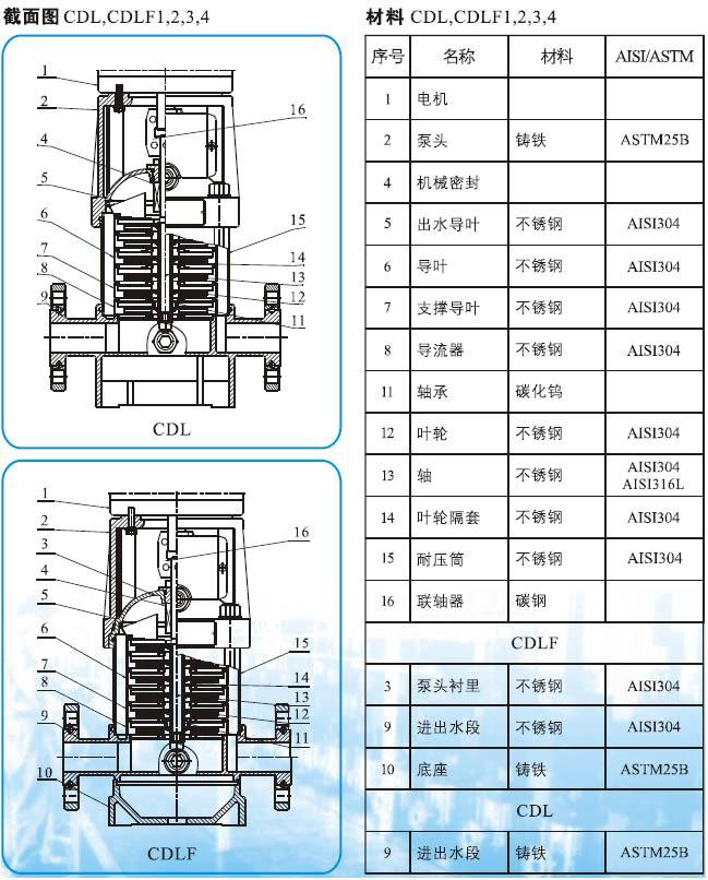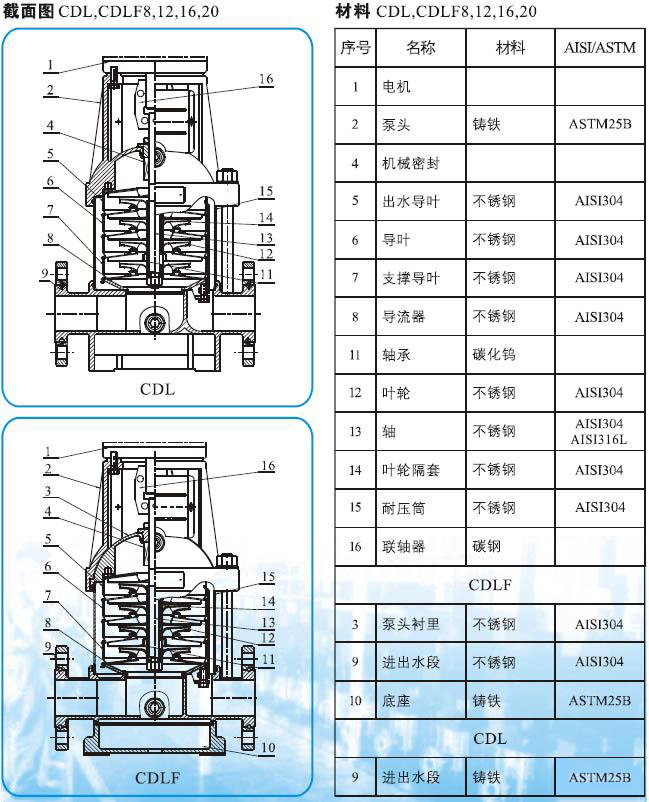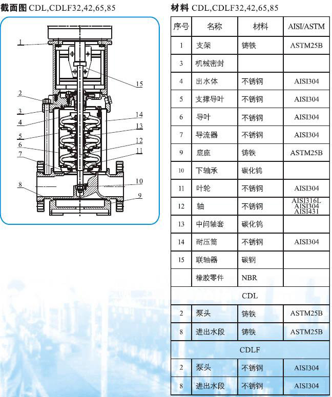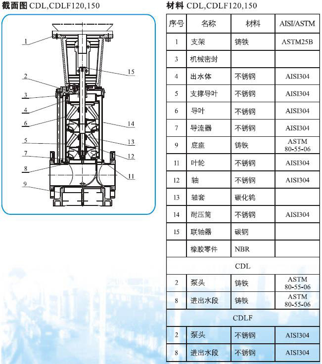 CDLF系列輕型不銹鋼立式多級管道泵(以下簡稱泵)是吸取了國內(nèi)外先進技術(shù)而設(shè)計制造的非自吸立式多級管道泵,采用標準立式電機和快裝式機械密封,更換非常方便。泵的過流部分均采用不銹鋼(304\316)材料制成,可適用于輕度腐蝕性介質(zhì)。該產(chǎn)品可替代國外CR、CRN等同類產(chǎn)品。產(chǎn)品投放市場后,以其高效節(jié)能、質(zhì)量可靠、使用范圍廣等特點,深受廣大用戶的喜愛。