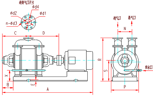 SK型水環(huán)式真空泵在端蓋上安裝有園盤,園盤上設(shè)有吸、排氣孔和橡膠球閥。橡膠球閥的作用是當(dāng)葉輪葉片間的氣體壓力達(dá)到排氣壓力時(shí),在排氣口以前就將氣體排出,減少了因氣體壓力過大而消耗的功率,從而降低功率消耗。