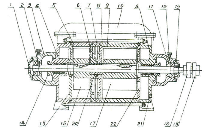 1、后軸承壓蓋 2、軸 3、軸承架 4、前后端蓋 5、短泵體 6、中間壁(B) 7、中間壁(A) 8、拉緊螺栓 9、長(zhǎng)泵體 10、連通管 11、調(diào)整墊 12、油杯 13、前軸承壓蓋 14、填料壓蓋 15、后蓋園盤(pán) 16、短葉輪 17、長(zhǎng)葉輪 18、泵聯(lián)軸器 19、電機(jī)聯(lián)軸器 20、軸套 21、進(jìn)水孔 22、前蓋園盤(pán)